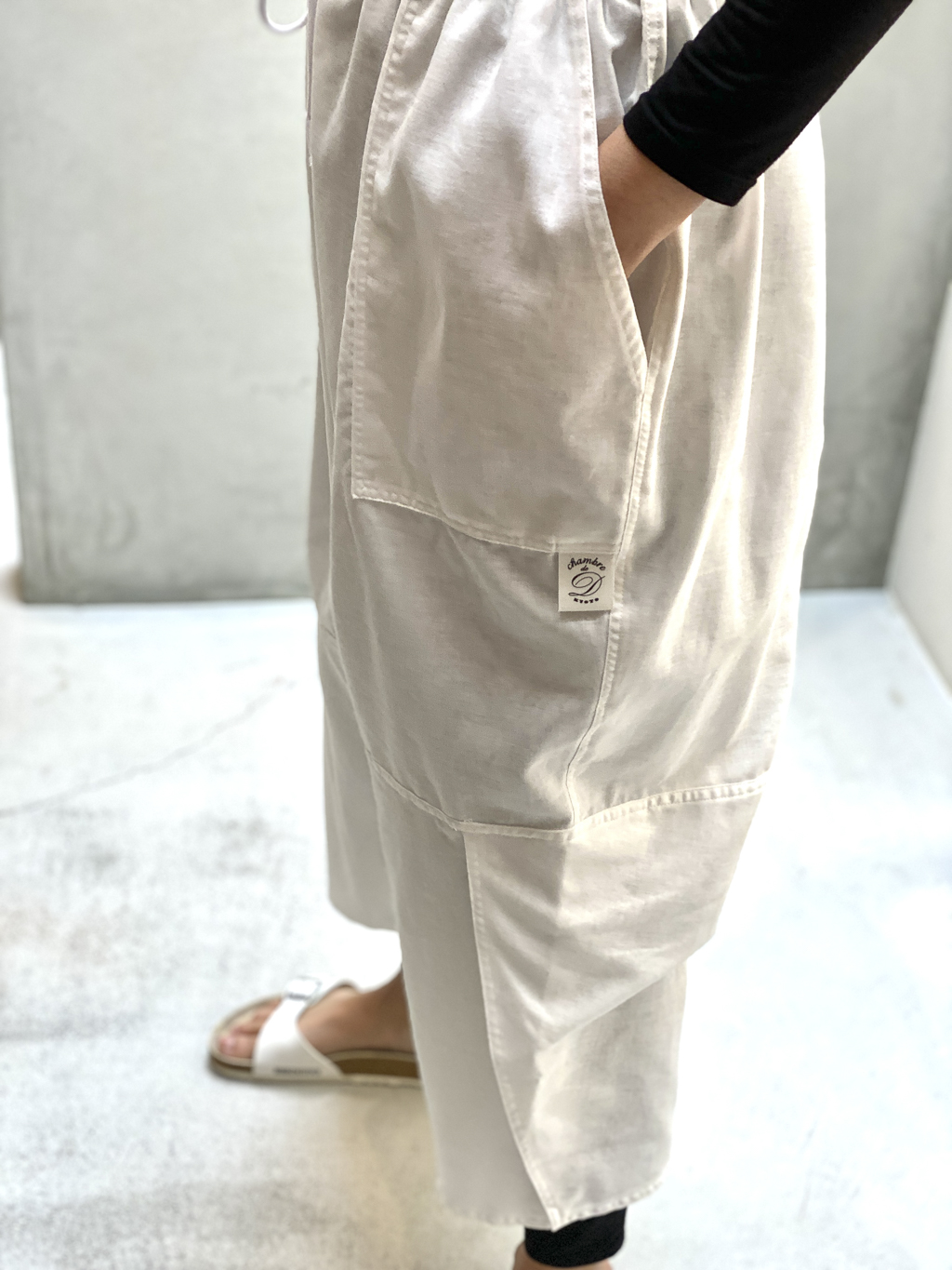 ダボっとワイドに履けちゃう楽ちんパンツです。膝部分に切り替えがされており、膝の曲げ伸ばしがしやすいような工夫が。また、裾にはスリットが入っていて、歩くたびにひらひらといい感じに足首を涼しげに見せてくれます。メンズもレディースもお洒落に着こなしてくださいね。