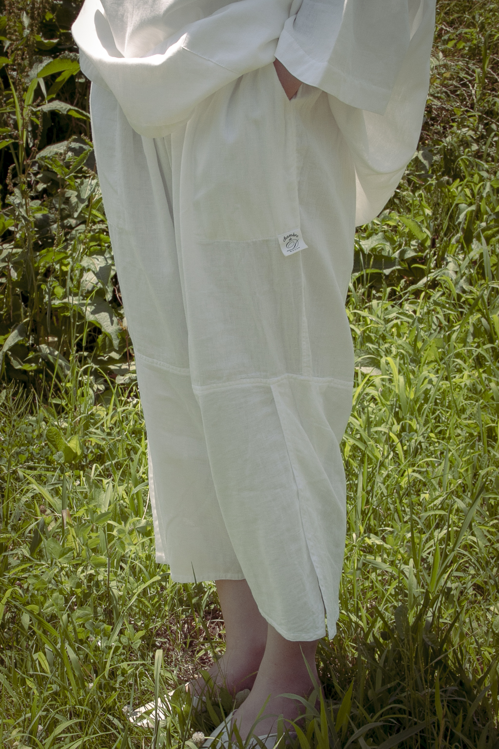 At the areas of the knees, a seam that connects a new piece of fabric is sewed on. The design at the knees makes bending and extending of the knees easier. At the cuffs of the pants, a slit that extends to the knee allows air to pass through. While walking, the cuffs of the pants prance with the breeze, allowing the ankles to cool down.