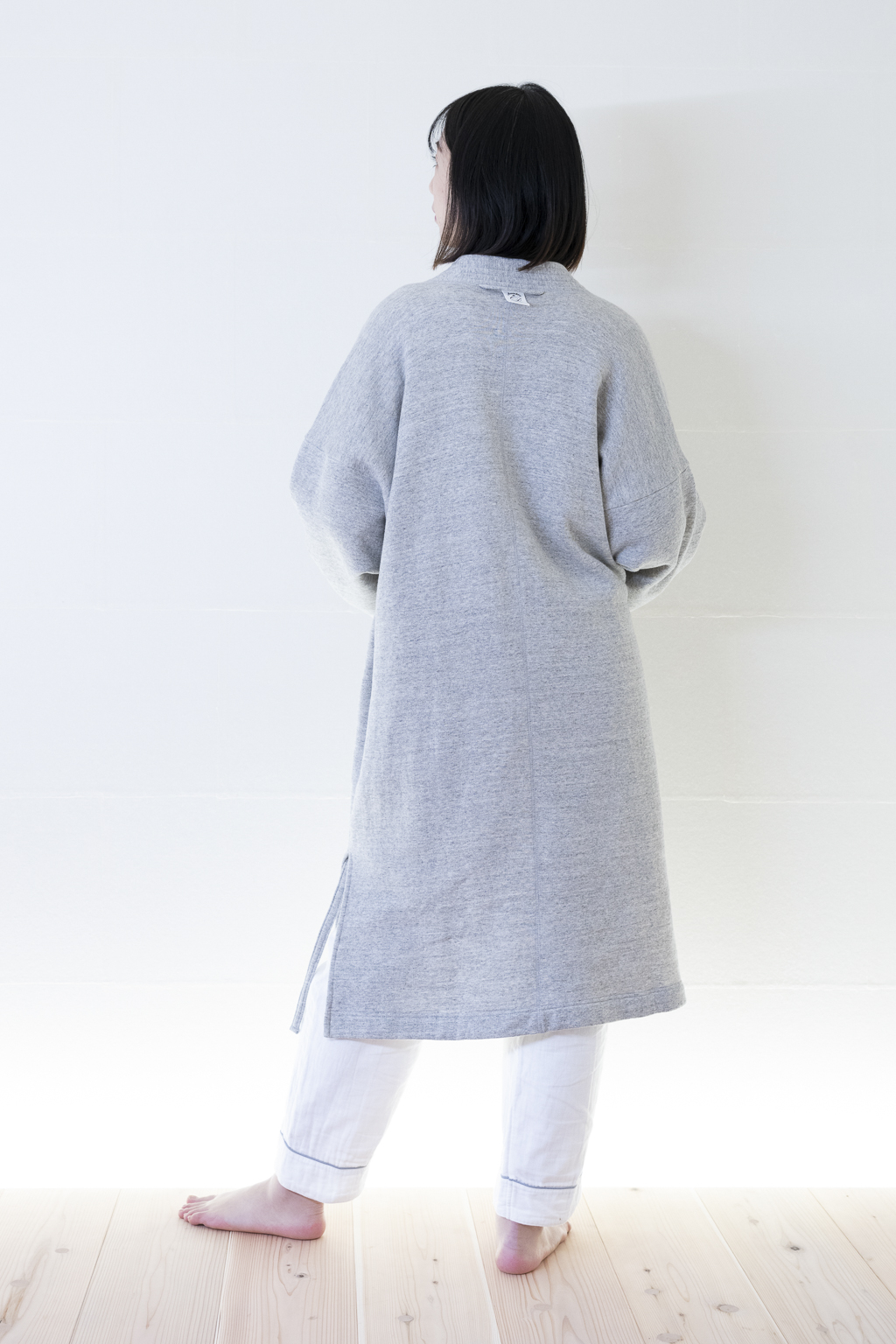 裏起毛のスウェット生地素材です。ゆったりとしたバスタイムのあとの、爽快な気分をそのまま纏ってみてください。腰紐をぎゅっとしばって、ハーフコートのように、または着流してロングカーディガンとしてちょっとコンビニまで。