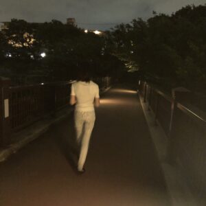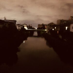 自宅の南側の真っ暗な疎水べりから濠川にかかるであい橋へ。
