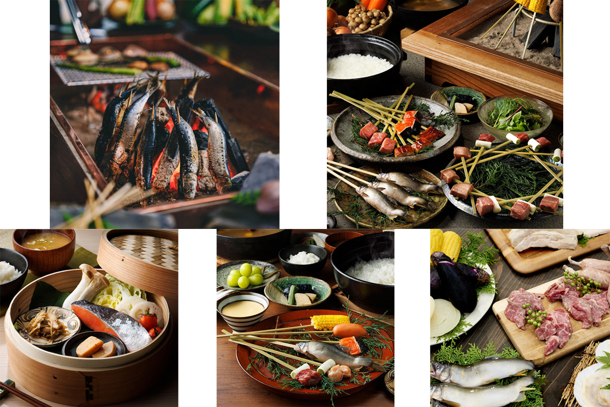 夕食は、囲炉裏の炭火で焼き上げる11種の串焼き(甲州牛・信玄鶏・魚介・旬野菜)を中心とした贅沢囲炉裏会席。季節の前菜・茶碗蒸し・土鍋ごはん・味噌汁・デザートと、山梨の旬を丁寧に。