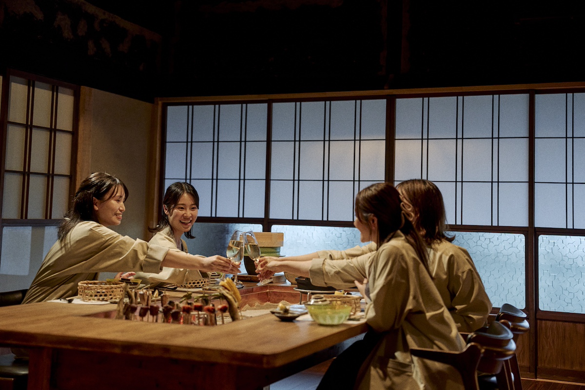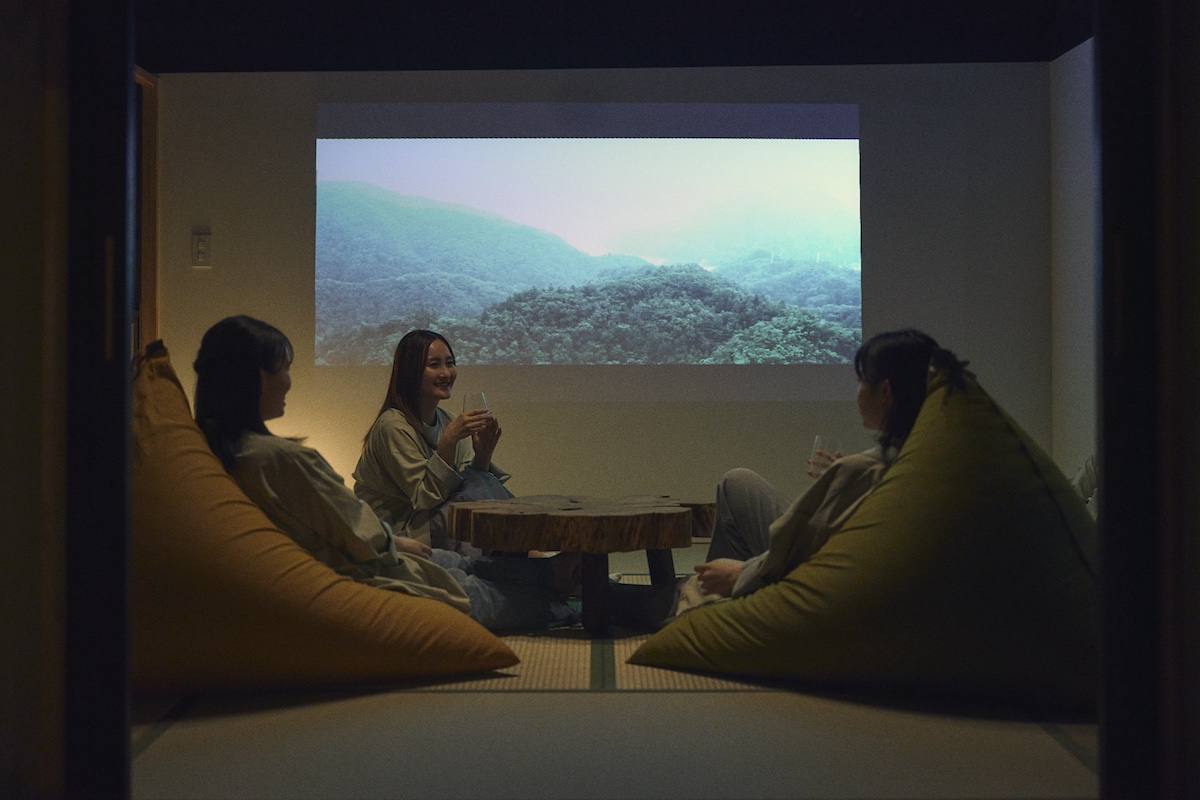 和室・リビング・縁側・お庭が一体となった広がりのある空間。囲炉裏テーブルを囲んで語らう夜、縁側でお茶を淹れて山あいの景色を眺める朝、浴室では「南部茶を使った入浴茶」を体験できます。プロジェクターも備え付けており、室内でゆっくり映画鑑賞なども可能です。