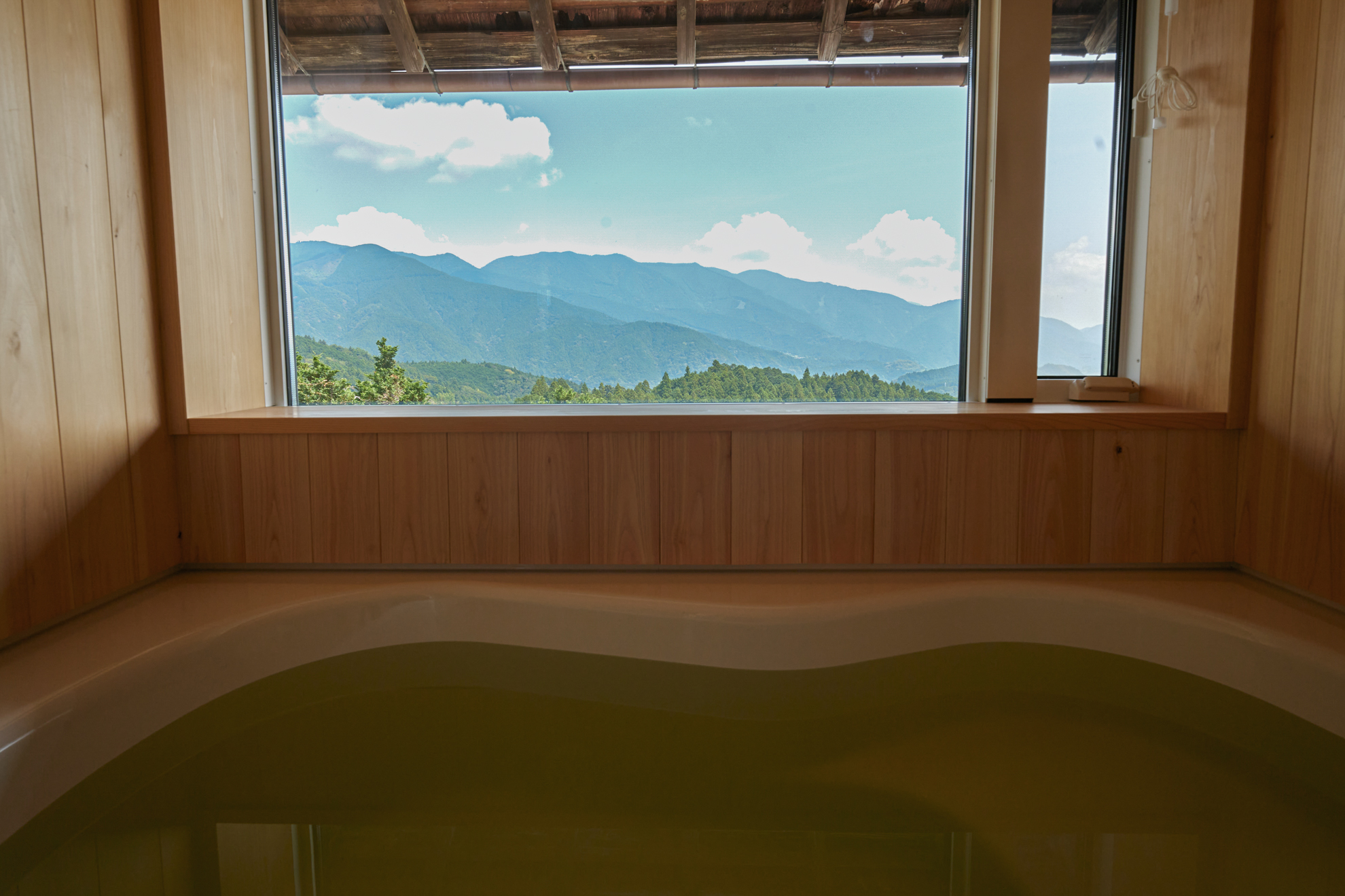 山あいに向かって開かれた浴室は、やわらかな光と湯気が重なり合う、穏やかな場所です。