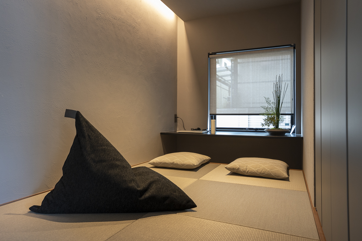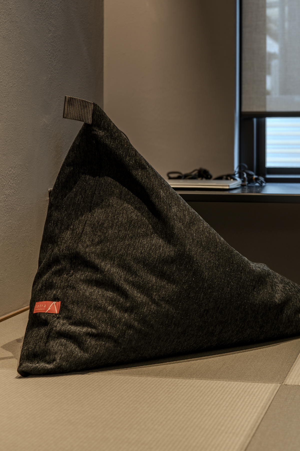 1階のヌック(小さなくつろぎスペース)には、形を自由に変えられ、座る人の体にやさしくフィットする〈tetra(テトラ)〉を設置。シンプルな空間に、やわらかな温もりと表情を添えています。