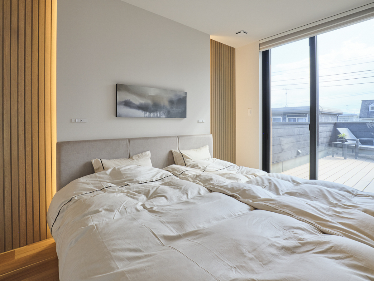 2階のウォークインクローゼットには、通気性と肌ざわりに優れ、季節を問わず快適にお使いいただける〈京和晒綿紗〉ガーゼパジャマを。主寝室には、吸湿性に優れた天然素材のベッドリネンとマットレスをコーディネートし、上質な眠りを体感できる穏やかな空間を演出しています。