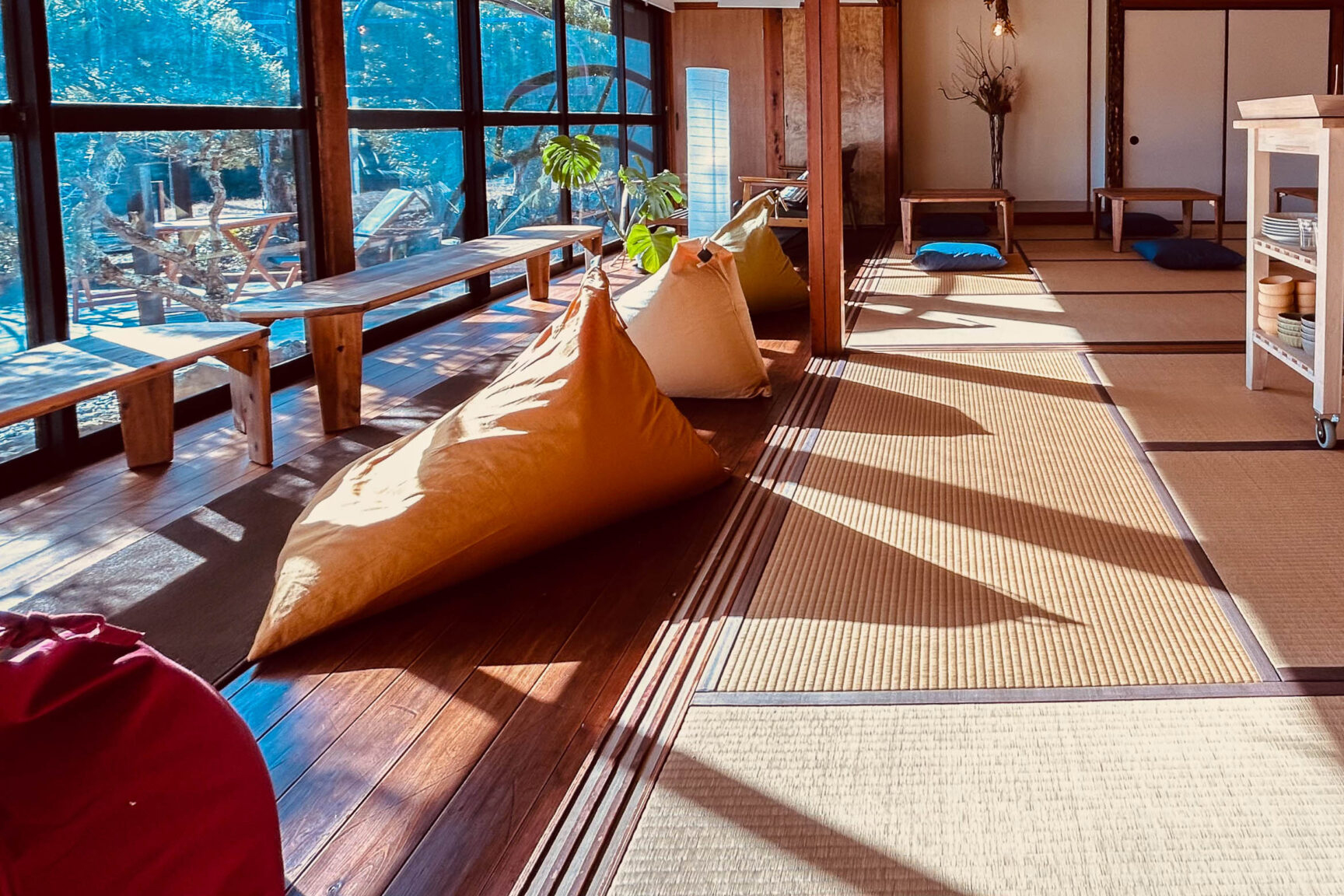 静岡県下田市のえんがわビュッフェOCO(オコ)は、”創作おばんざい”と”ごはんと酒がすすむ野菜料理”をテーマにしたビュッフェスタイルのレストランです。座・気ままに座り、縁側から望む里山の自然を感じながら、豊かな山の幸を味わうことができます(予約制)。