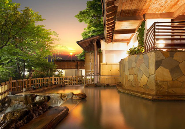 伊香保のシンボル「石段街」からほど近い「森秋旅館」は、「シャボン玉」「七つの子」「兔のダンス」など枚挙にいとまがない、誰でも耳にしたことがある童謡の作詞、詩人として名をはせる野口雨情が定宿としたほどの名宿。伊香保に湧く2種類の温泉のひとつ「黄金の湯」を源泉かけ流しで堪能できる開放的な露天風呂「雨情の湯」は、季節ごとに姿を変える山々を借景に、心身ともに癒してくれます。