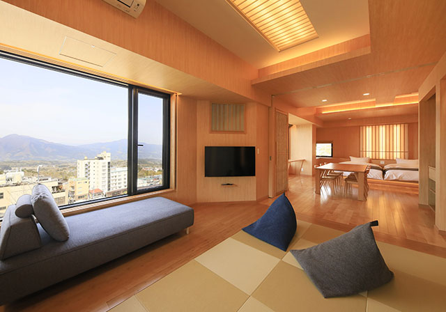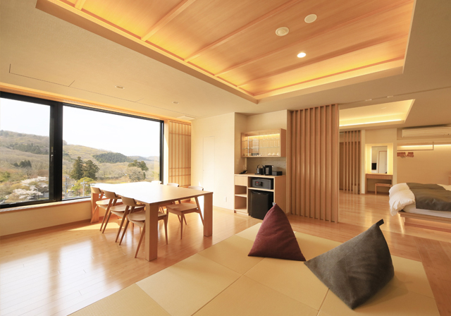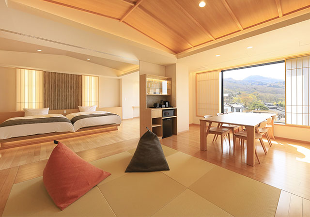 客室も多彩で、なかでも【プレミアムスイート】美峰や【デラックススイート】紫雲(しうん)紅雲(こううん)では、部屋の随所から、上州の山々や伊香保の石段街を展望することができ、日常から離れて美しい景色を一望できます。その他の各部屋でも、使う人、過ごす人の目を飽きさせない伝統的な日本文化の要素とモダンな設備が調和し、「泊まる」から「過ごす」へ、他とは異なる時間の流れを感じていただけるはずです。