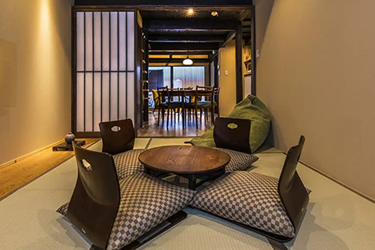 空明は京都の町家を使用したゲストハウスです。 隅々に、古き良き日本の上品なしつらえとモダンなデザインが取り入れられ、快適に京都の生活スタイルをご満喫いただけます。 最寄駅は京阪清水五条駅、七条駅まで6分です。また京都駅までは徒歩15分という観光にも便利なロケーションでありながらも大通りから離れており、 静かで落ち着いたご滞在が可能です。室内は広々とした空間と落ち着く雰囲気で、リビングルームではビーズクッションtetra(テトラ)でのんびりとおくつろぎいただけます。 ご家族やグループでの京都観光の拠点に最適なご宿泊施設です。