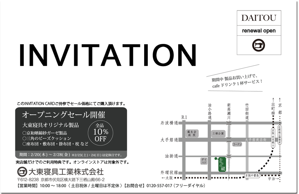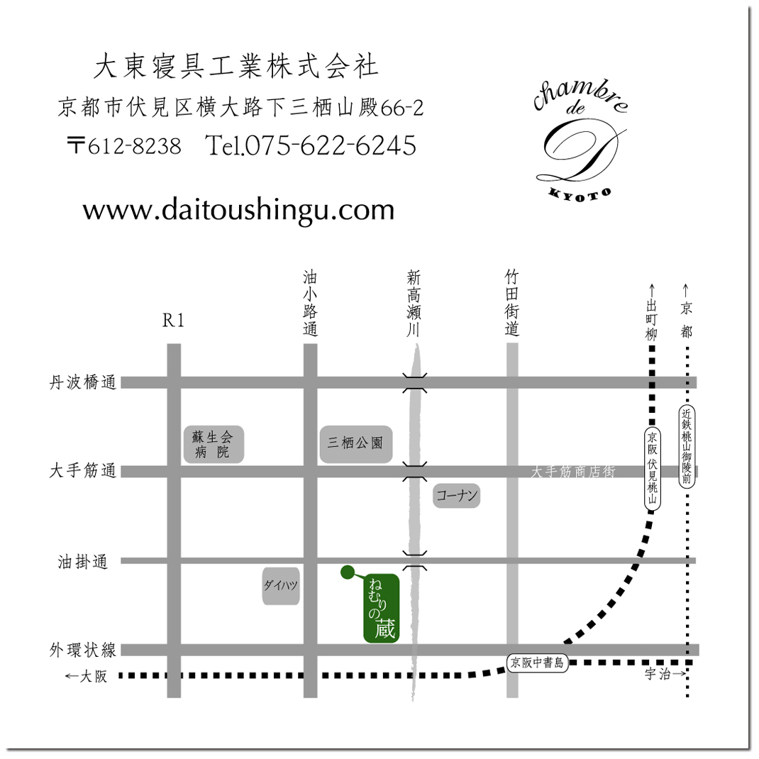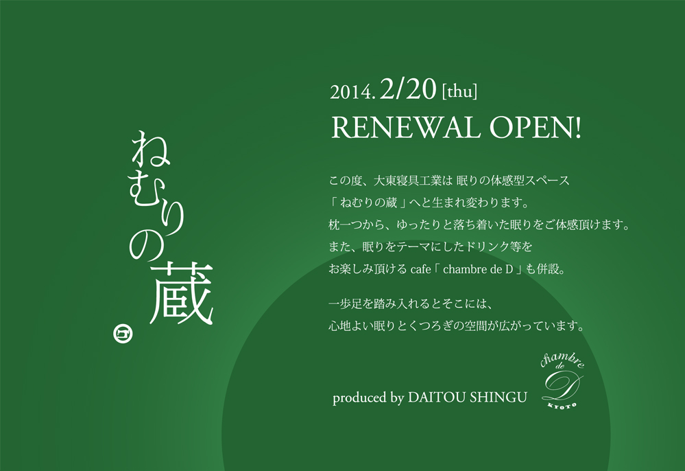 下記の通り、大東寝具工業の伏見本店は ねむりの蔵 としてリニューアルオープンいたします。