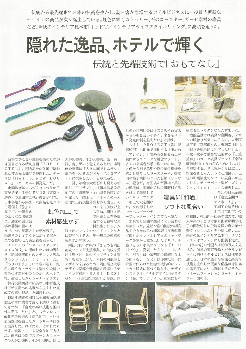2017年10月20日号の「週刊ホテルレストランHOTERES」のインテリアライフスタイルリビング展 特集ページで当社をご紹介いただきました。