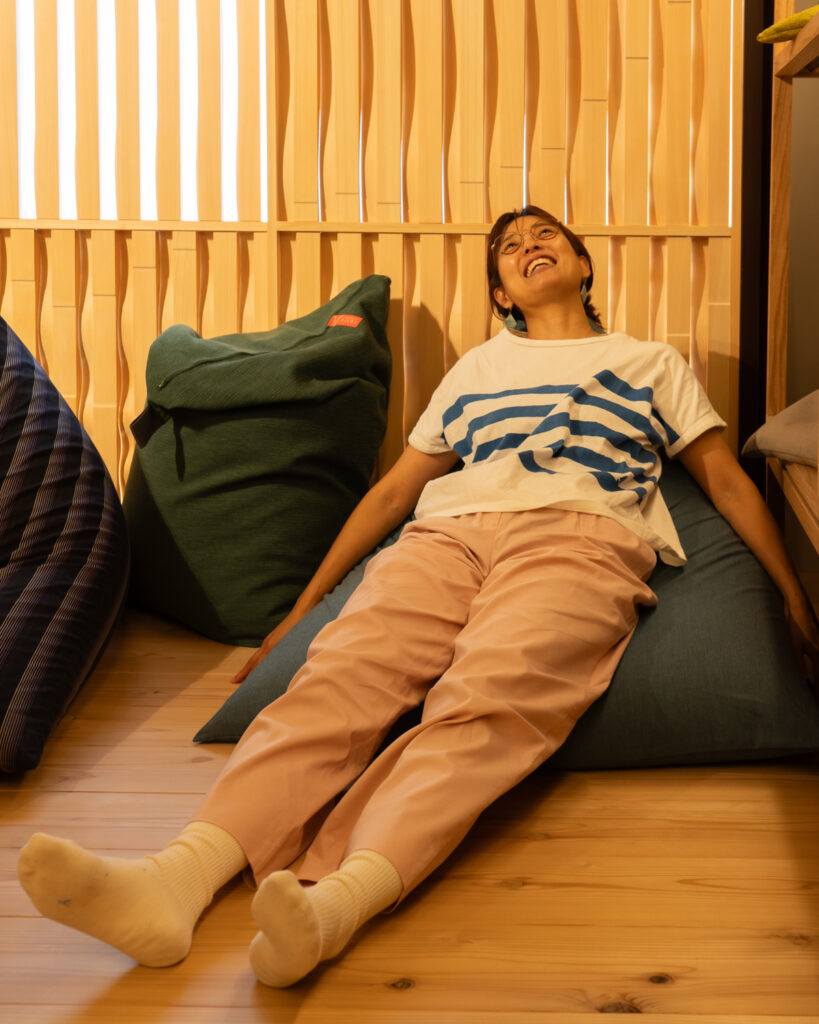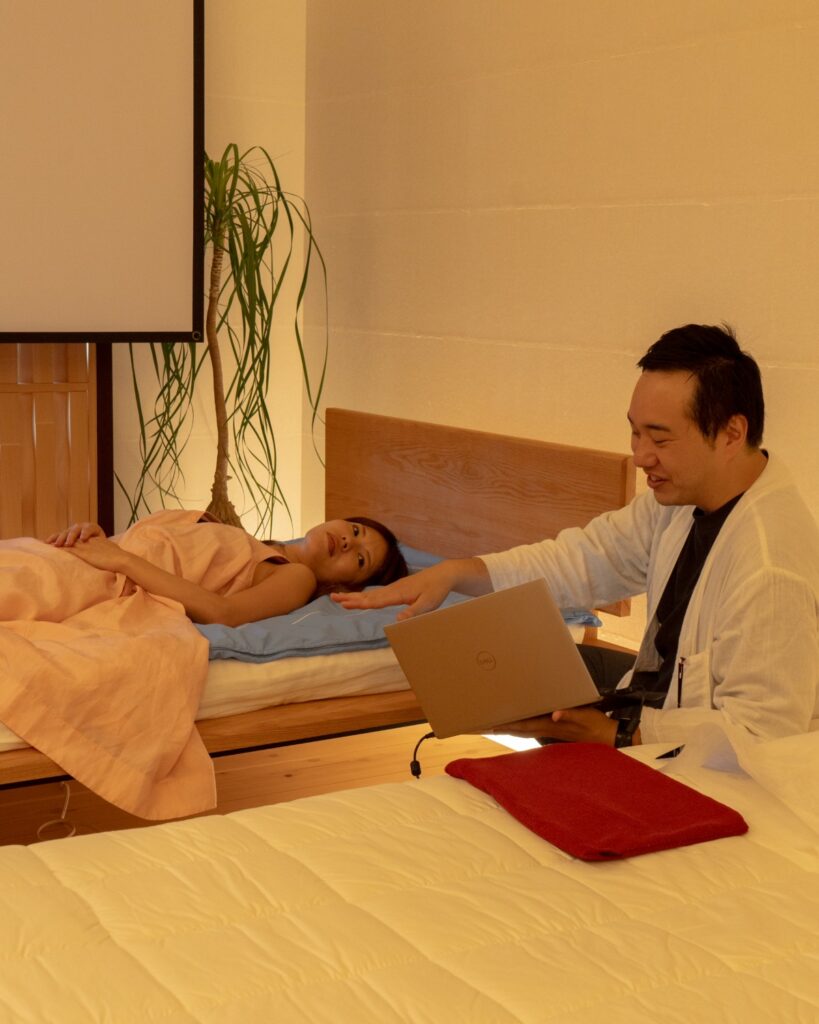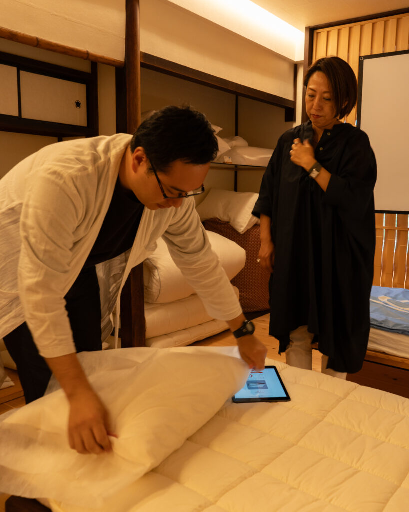後半は、「ねむりの蔵 四条烏丸店」の1階・2階を会場に、AIによるフィッティングや枕の調整を通じて、個別の睡眠相談を実施。ビーズクッション「tetra(テトラ)」や、京和晒綿紗ガーゼ製品の心地よさも実際にご体感いただきました。