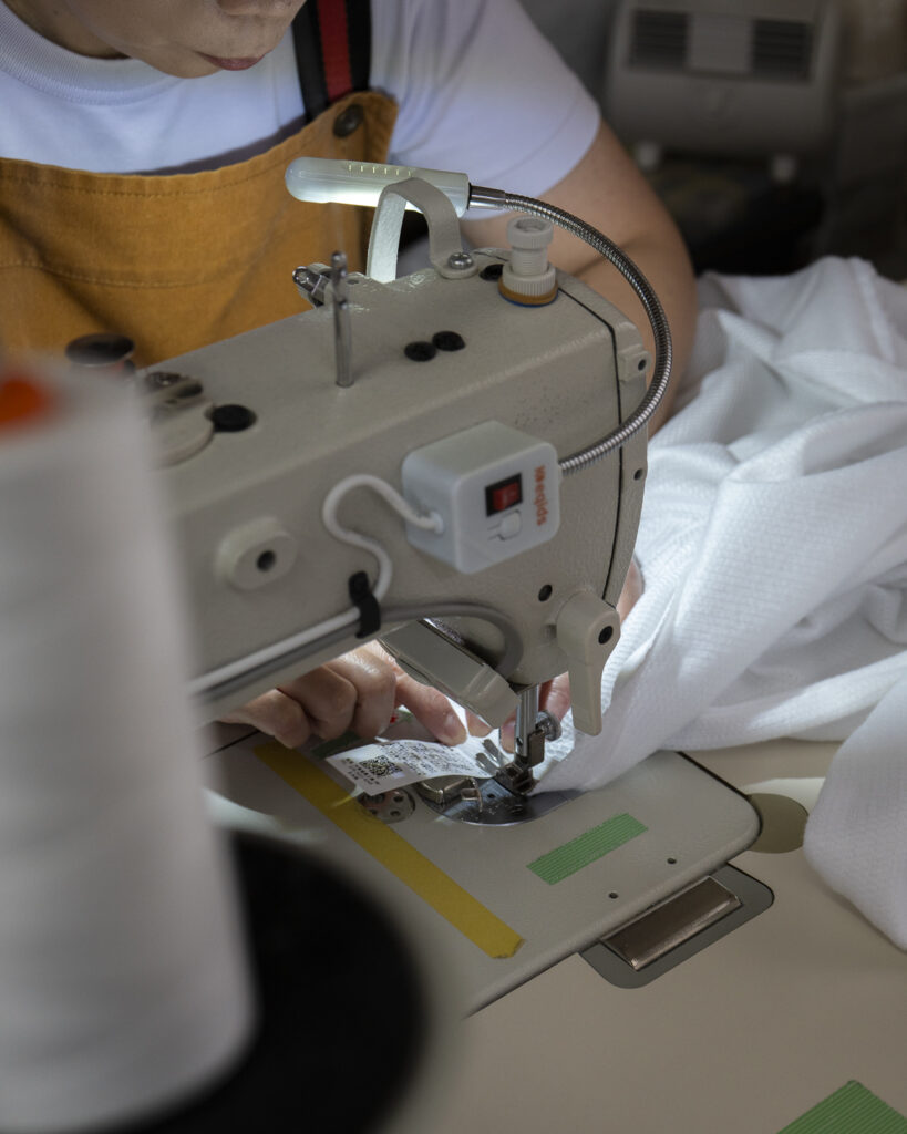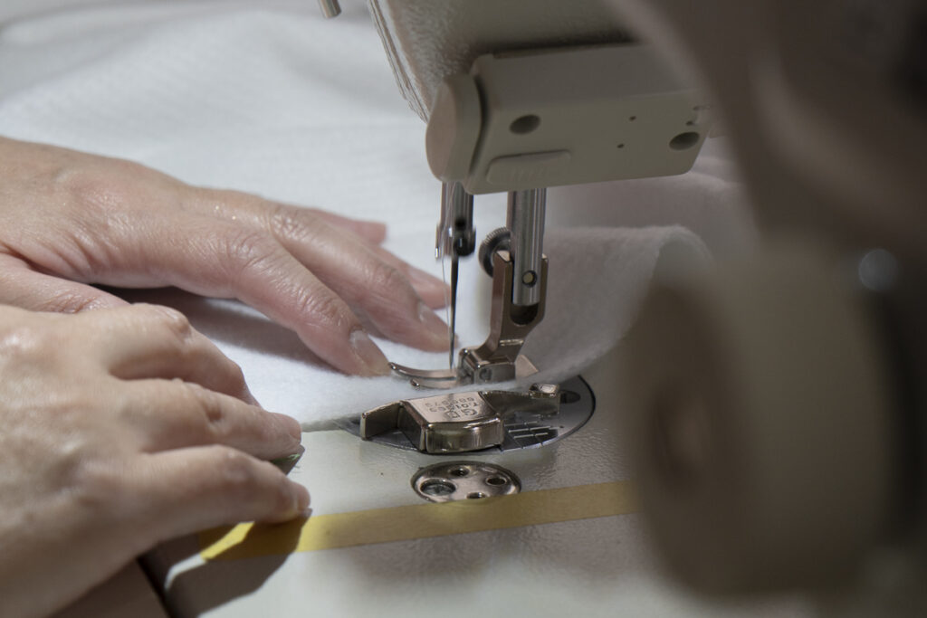 生地は帝人フロンティア株式会社の「エコペット®️」を使用した、ECOメッシュ生地で仕上げています。ファスナーの向きなど慎重に中材のアクアビーズが入る部分のステッチ、首の部分や肩の部分にも立体的に見せるステッチなど入れて一枚一枚丁寧に仕上げています。