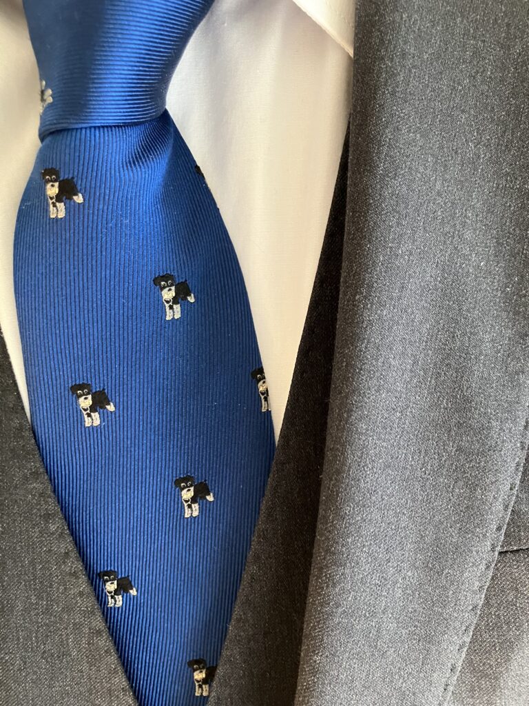 今年は、愛犬のミニチュア・シュナウザーがあしらわれたネクタイです。