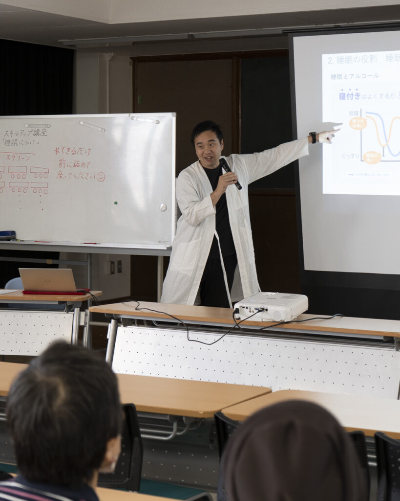 睡眠の役割や関連データの解説に加え、睡眠に関するクイズ、ソーシャルジェットラグ(社会的時差ボケ)を確認するチェックシートのワーク、そして質の良い眠りにつながる一日の過ごし方についてもお話ししました。
