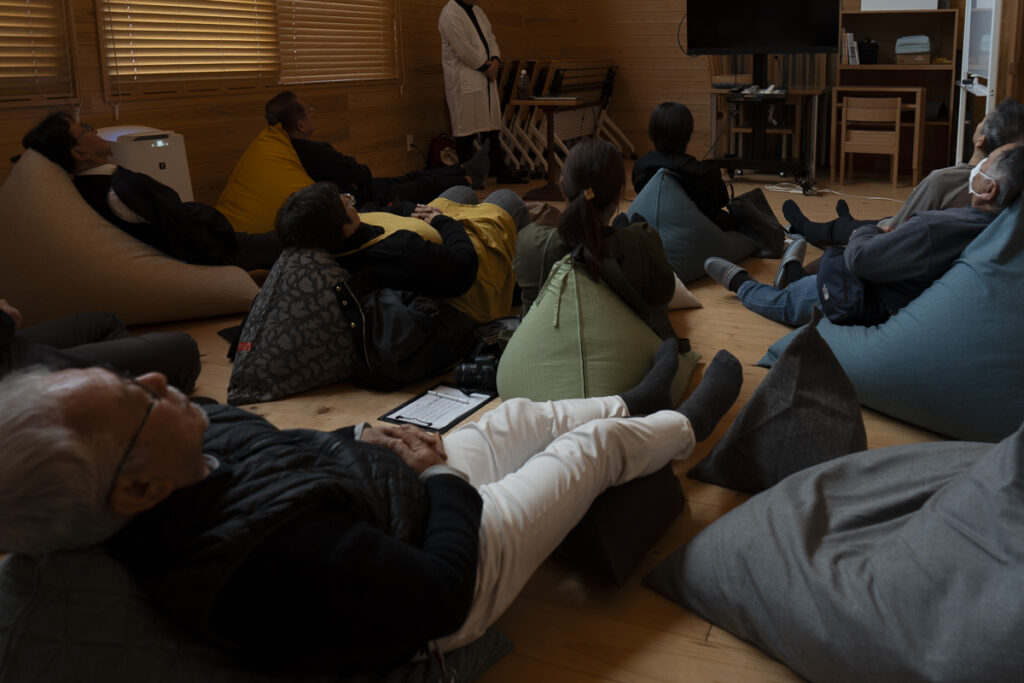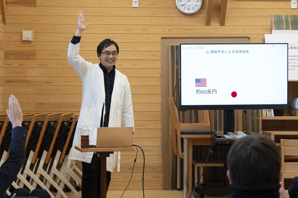 当日は、睡眠の役割や最新の関連データの解説に加え、睡眠にまつわるクイズ、ソーシャルジェットラグ(社会的時差ボケ)を確認するチェックシートのワーク、一日の過ごし方と眠りの質の関係についても詳しくお伝えしました。プログラムの最後には、15分ほどのリラックス仮眠体験を行い、多くの方に心地よい休息を体感していただきました。