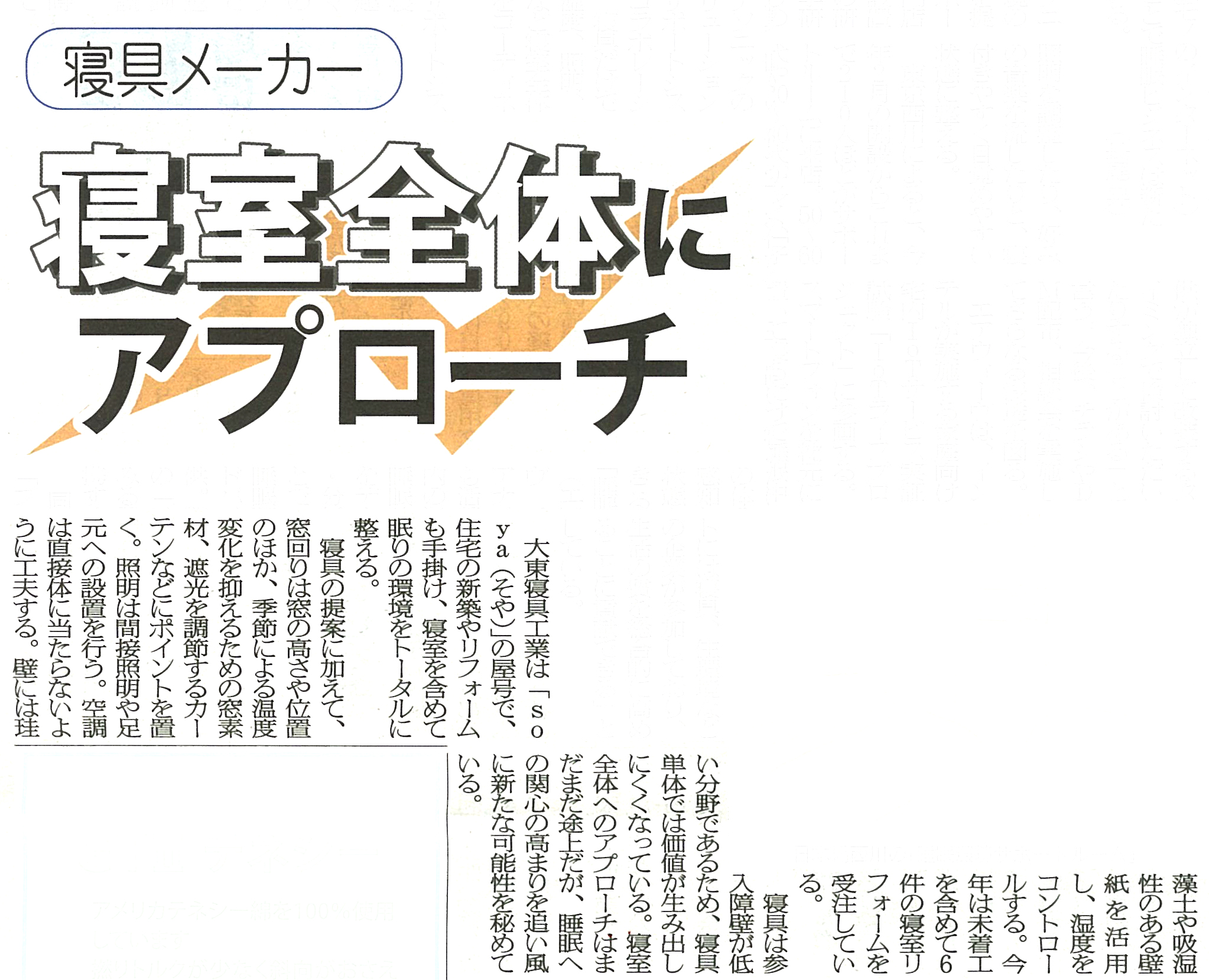 ダイセン株式会社 発行の 繊維ニュース (9/5発売号)「寝具メーカー 寝室全体にアプローチ」特集に、当社の建築/建装部門 素家(そや)の取り組みをご紹介いただきました。