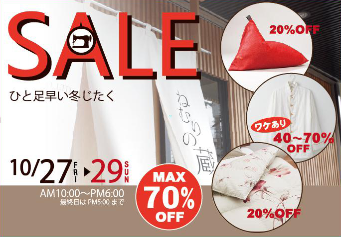 2017年10月27日(金)~29日(日) まで、ねむりの蔵 京都伏見本店で毎年恒例の冬じたくSALEを開催いたします。