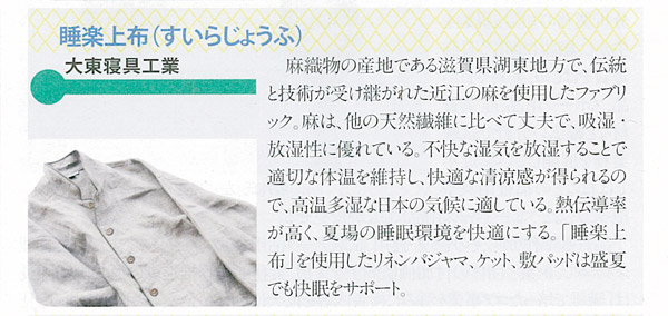 睡楽上布(すいらじょうふ)は、麻織物の産地である滋賀県湖東地方で、伝統と技術が受け継がれた近江の麻を使用したファブリック。麻は、他の天然繊維に比べて丈夫で、吸湿・放湿性に優れている。不快な湿気を放湿することで適切な体温を維持し、快適な清涼感が得られるので、高温多湿な日本の気候に適している。熱伝導率が高く、夏場の睡眠環境を快適にする。「睡楽上布」を使用したリネンパジャマ、ケット、敷パッドは盛夏でも快眠をサポート。
