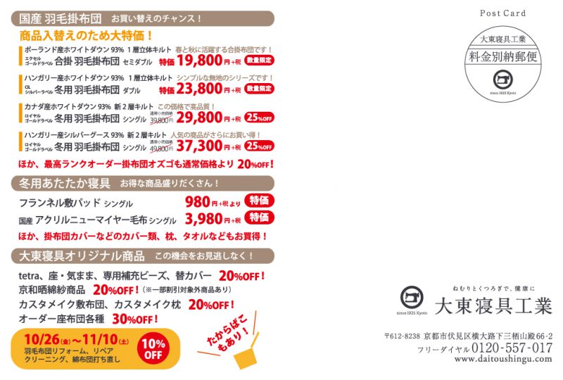 秋冬に向けた寝具・寝装品やその他お買い得な商品を多数ご用意しておりますので、ぜひこの機会にご来店をお待ち申し上げております。