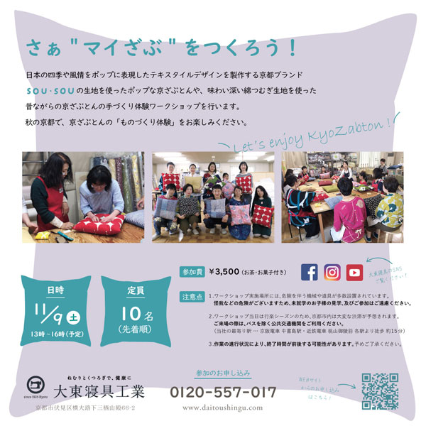 日本の四季や風情をポップに表現したテキスタイルデザインを製作する京都ブランドsou・souの生地を使ったポップな京ざぶとんや、古くから京着物に使われる伝統の紬(つむぎ)のような生地で、昔ながらの京ざぶとんの手づくり体験ができます。