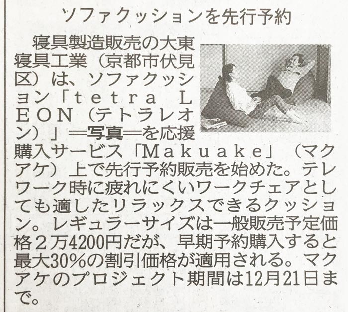 京都新聞(10月22日・13面経済プラス)に、応援購入サイト「Makuake」で進行中の新製品「tetra LEONプロジェクト」についてご紹介いただきました。