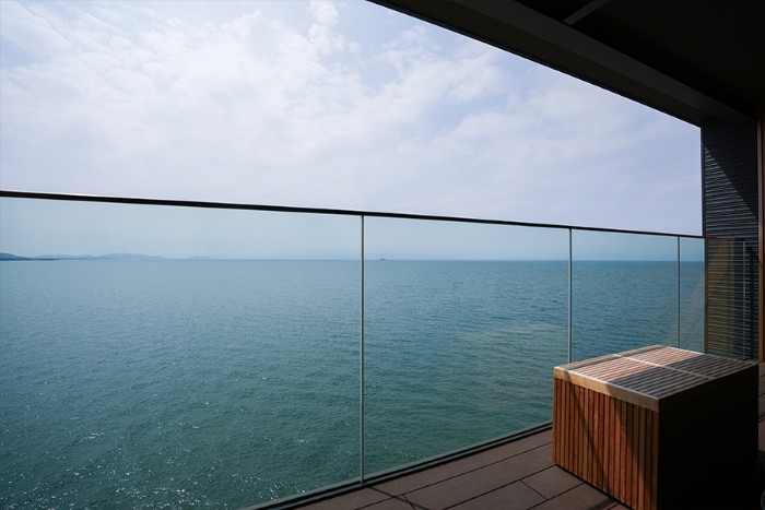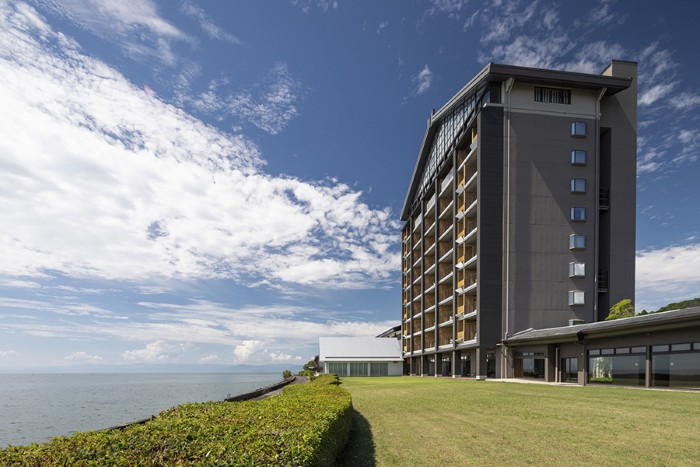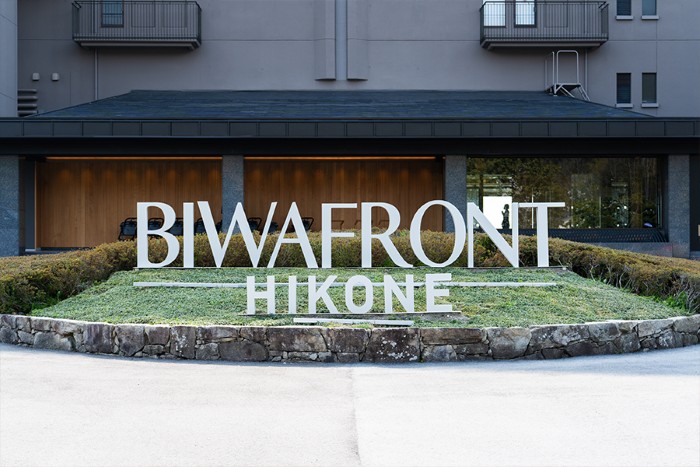 蒼の湖邸 BIWAFRONT HIKONE(ビワフロント彦根)は、雄大な湖や対岸の比良山系まで何も遮るものはないパノラマが目の前に広がるロケーションです。一刻一刻と表情を変える琵琶湖の”蒼”と、対岸の稜線に沈みゆく夕陽で紅く染まる空の”茜”とが交差する神秘的で美しい情景を、最上階展望ラウンジや客室テラス、または自家源泉を引いた温泉露天風呂などからお愉しみいただけます。