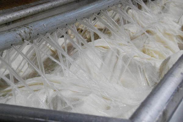 現在の晒は合理性と生産性を重視した洋晒と呼ばれる自動精錬という設備で、約40分から80分程度という短時間で、テンション(張力)や熱、そして塩素系漂白剤などを付加しながら繊維自体に大きなストレスを負荷しながら処理されます。その仕上げには、柔軟材や化学物質が添加された状態で晒の最終工程を終えます。