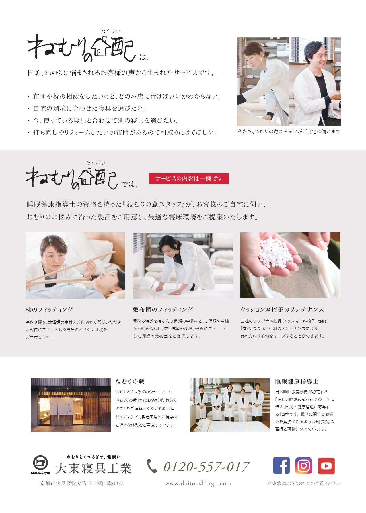 睡眠健康指導士の資格を持つねむりの蔵スタッフが、お客様のご自宅にお伺いし、枕のフィッティングを行ったり、お布団をお届けをさせていただく「ねむりの宅配」の出張可能エリアを拡大しました。