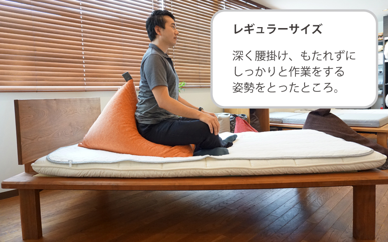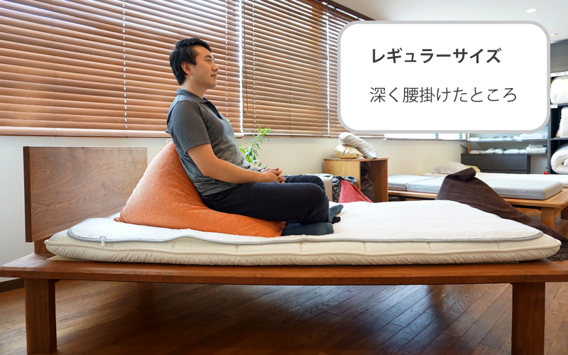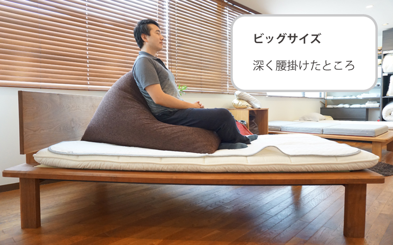 171㎝の男性スタッフに、シングルベッドの上で、レギュラーサイズ、ビッグサイズそれぞれ、浅く座ったところ、深く座ったところを試してもらいました。
