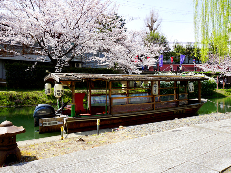 桜の季節はこのような桜のトンネルを十石舟で通り抜けることができます。