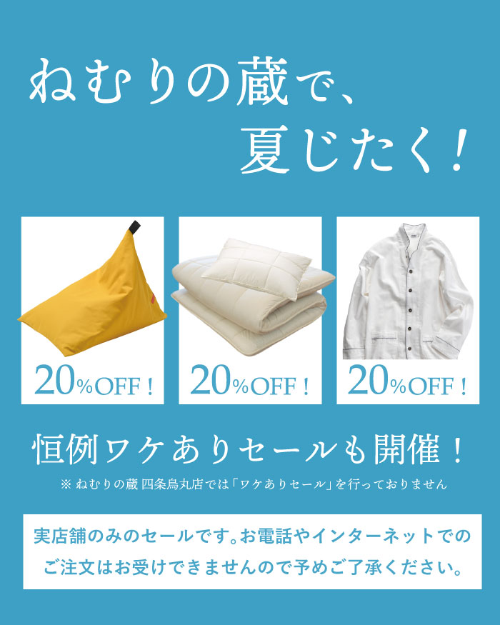 「ねむりの蔵 四条烏丸店」の店頭で、セール告知ハガキ または SNS(ねむりの蔵 京都伏見本店・ねむりの蔵 四条烏丸店・大東寝具工業)のセール告知ページをご提示いただくと、京和晒綿紗製品または、ビーズクッションtetra(テトラ)製品を「ねむりの蔵 京都伏見本店」と同様の特別価格にてお買い上げいただけます。