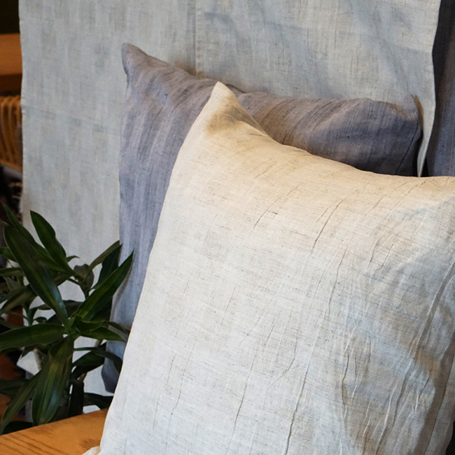 麻製品の本場、近江で生まれたシボ加工と、よろけ織によるドット柄のような模様はナチュラルな中にも個性があり、和のインテリアにも洋のインテリアにも合いそうです。