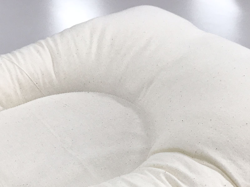 Cカーブ敷布団のカバーには、当社の京和晒綿紗を使用。やわらかな肌触りのガーゼ生地、寝汗も吸い取り、生まれたての赤ちゃんの肌への刺激を考慮し、縫製にもこだわっています。空気に包み込まれたふんわりとした優しいガーゼです。
