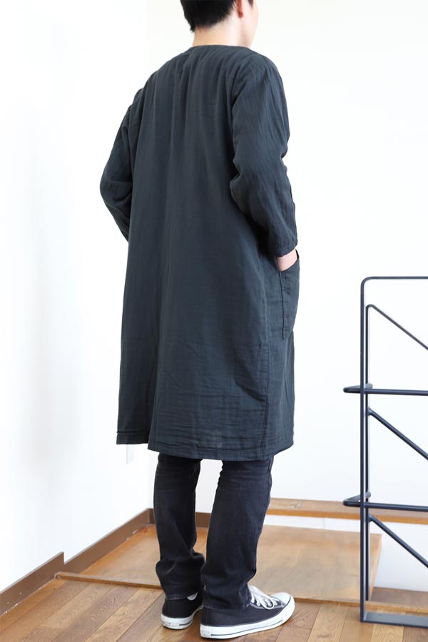 4日間釜熟成「京和晒綿紗」ガーゼの風合いを損なわない植物性染料を使用し、化学染料の画一的な発色とは異なる渋みと深みが重なりあった深いグレー「すみくろ」です。