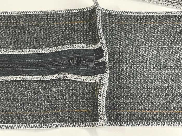 「箱座布団」のパーツは、表面・裏面の他、側面のファスナーを付けていきますが、「箱座布団」の側面中央にファスナーが位置するように、裏側から上下のバランスを見て付けていきます。ここが工程の中で一番難しい部分です。