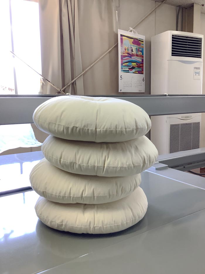 今日は朝から、ご注文いただいた円形座布団の仕上げをしました。