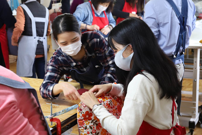 先日、約2年ぶりに京座布団制作のワークショップが当社工場で開催されました。