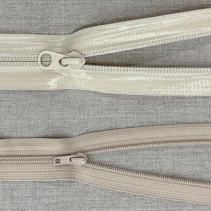 今回初めて止水ファスナーを採用しました。ファスナーの表面にラミネート加工を施しているため、水が浸透しにくくなっています。スライダーを上げ下げする際の引き手金具が通常のファスナーより大きなつまみになっているので、扱いやすいです。