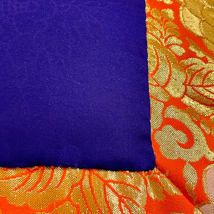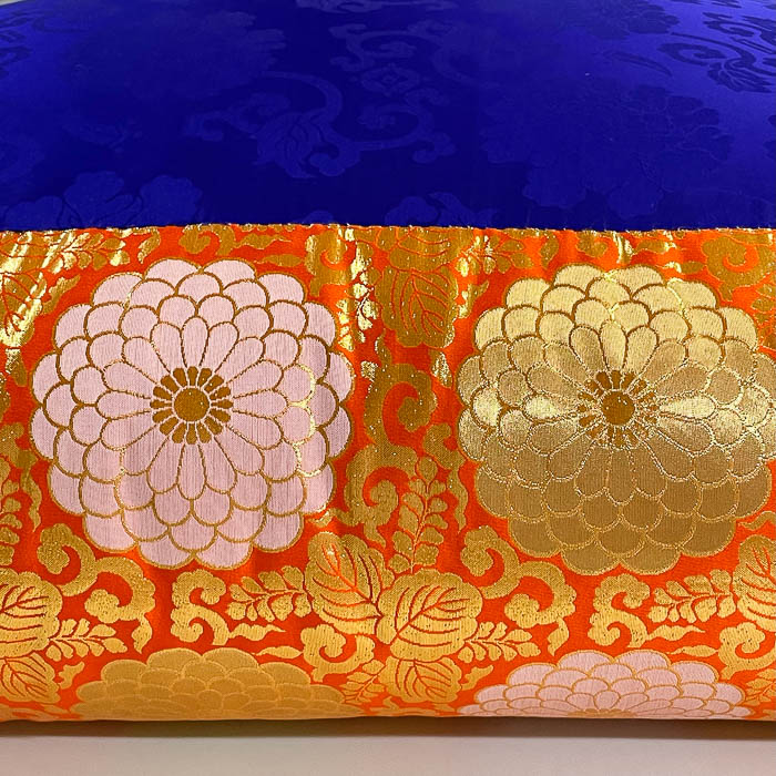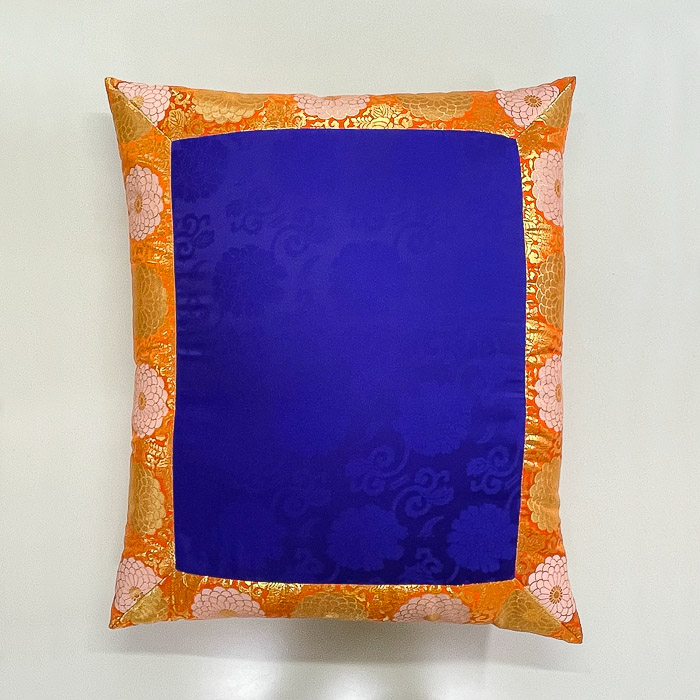 真ん中部分の青い生地は正絹(しょうけん)という繊細な生地なので、慎重に傷つかないように仕上げました。85cm × 100cmの立派な座布団が無事完成しました!