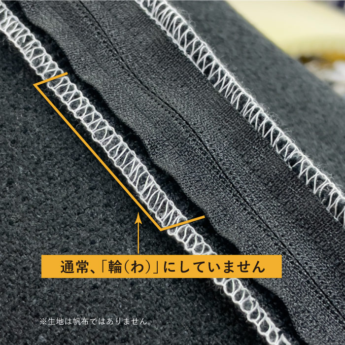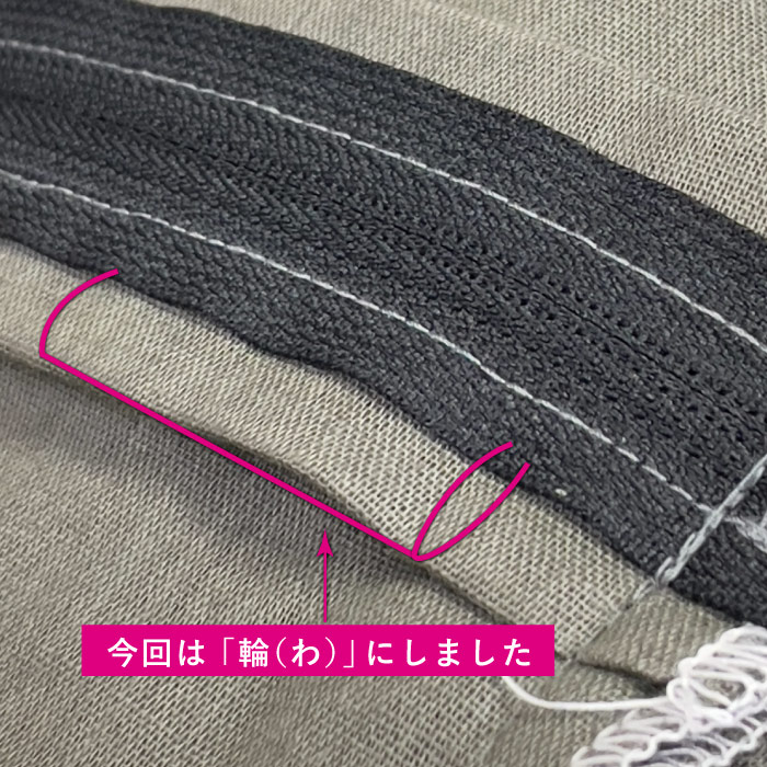 ファスナー部分側を「輪(わ)」にして、裏の見た目も良くなるようにしています。その「輪(わ)」の間にガーゼを1枚挟み込み、ガーゼを3重合わせにしているので、いつもより1パーツ増やした合計6枚で製作しています。