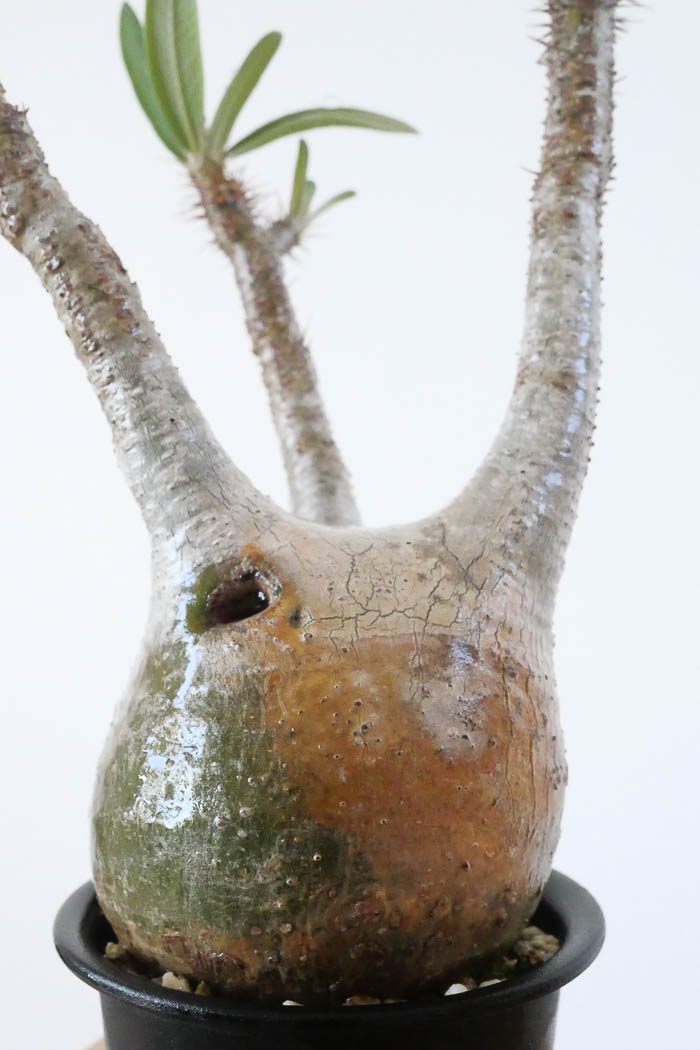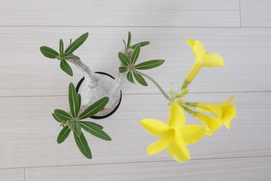 パキポディウム・グラキリスという種類の塊根(かいこん)植物です。マダガスカルが原産地でずんぐりむっくりな感じか可愛い!3年前に購入し、初めての開花でとても嬉しかったです。春はやっぱりいいですね!