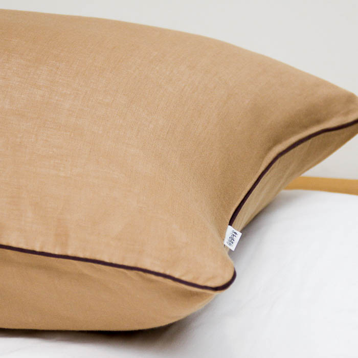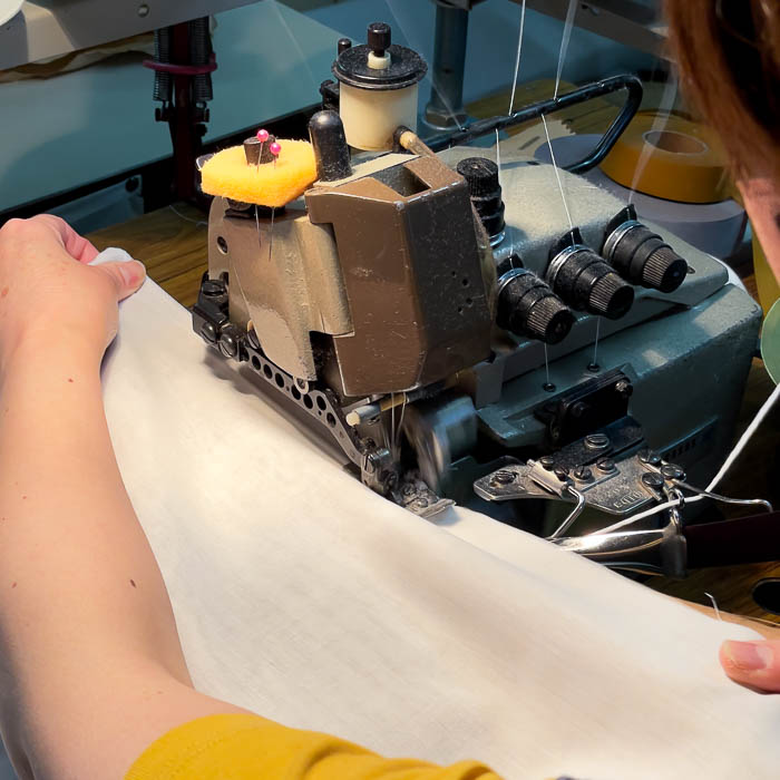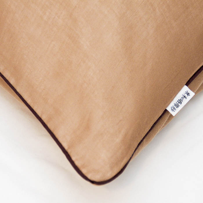 柿渋染めと白の2種類の生地を使用して合わせる為、縫いズレが無いように慎重にコードパイピングを入れながら生地を縫い合わせて仕上げています。