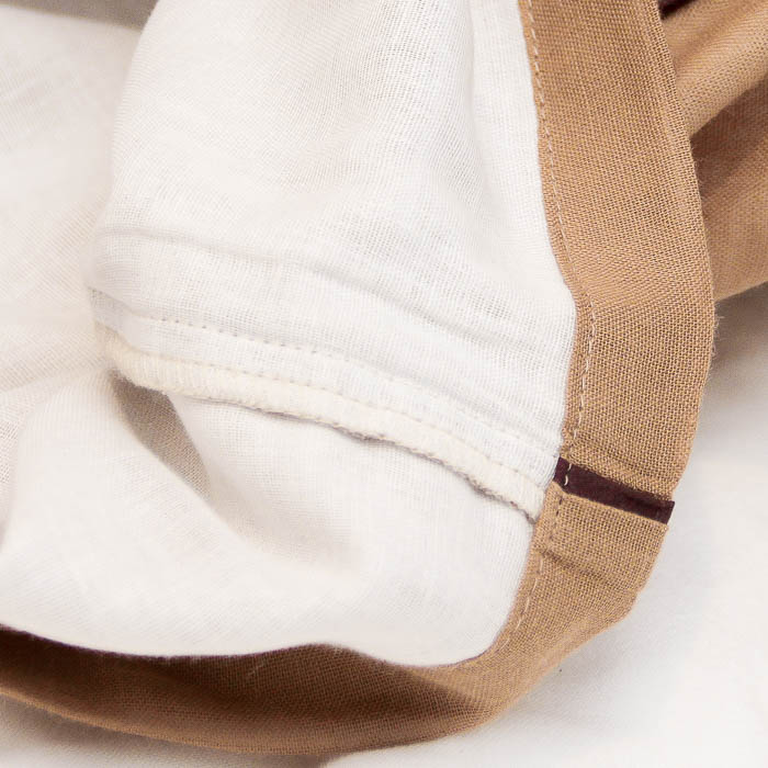 表生地は京和晒綿紗の柿渋染めを1枚(1重)、裏生地は京和晒綿紗の白を2枚(2重)、