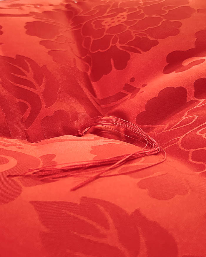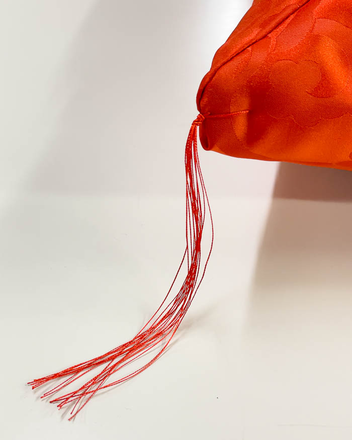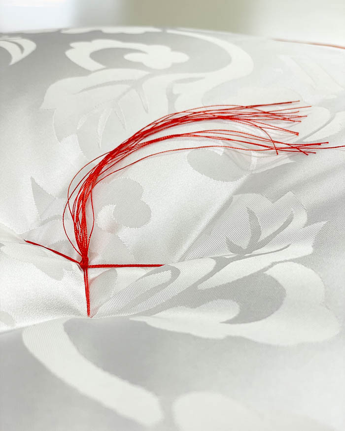 綿入れ口を手絎けで閉じて、側生地と同系色の綴じ糸で中綴じをして、四角に房を付けて完成です。
