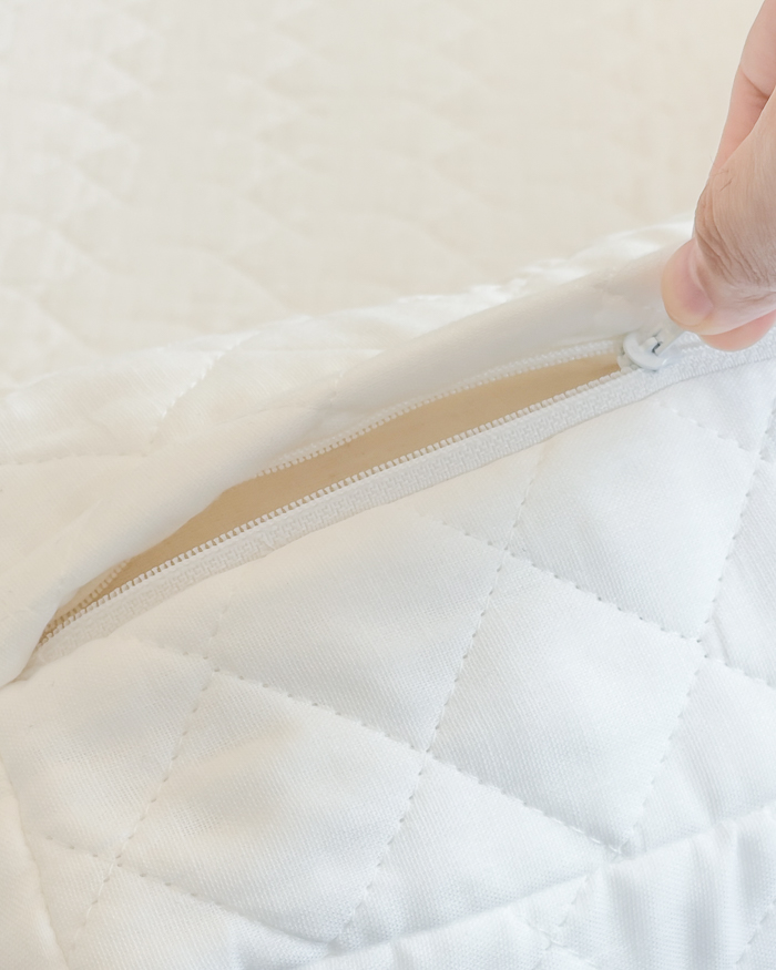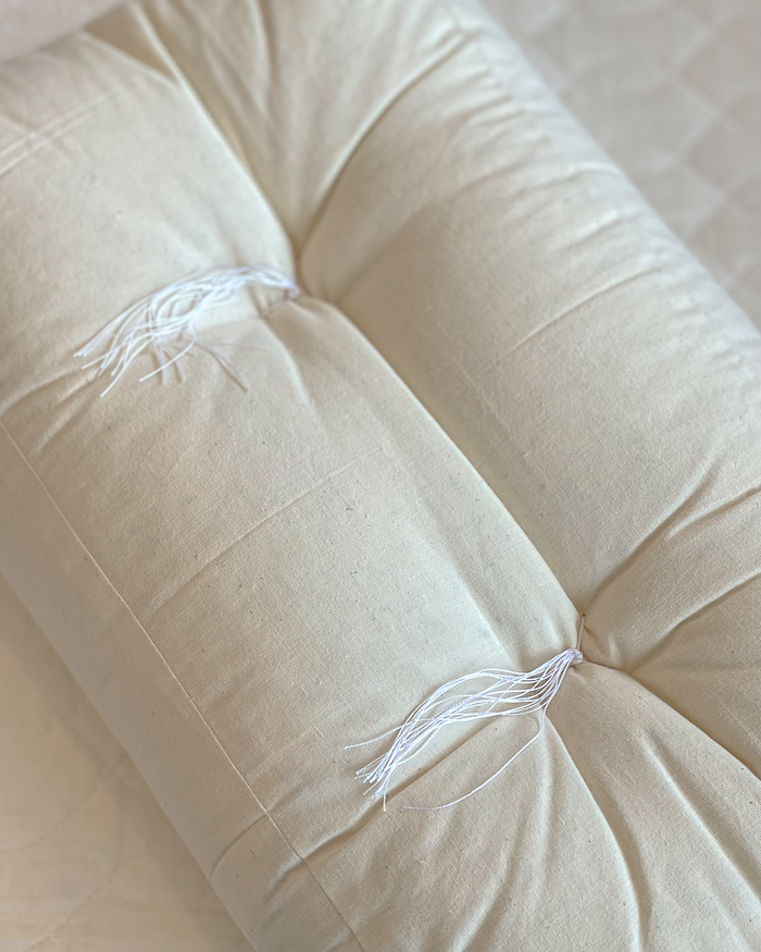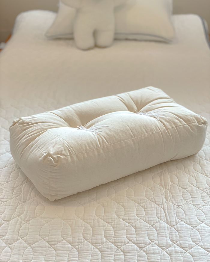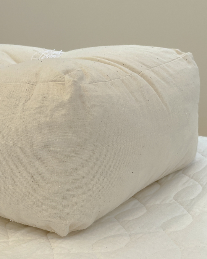 先日、ショールーム「ねむりの蔵」の展示用としてフットピロー(足用の枕)を製作しました。ヌード座布団の布地で箱型に縫製して中綿を入れた後、綿入れ口を閉じ、左右対称に2ヶ所に中綴じをして完成です。サイズは幅50cm x 奥行26cm x 高さ13cmになっています。