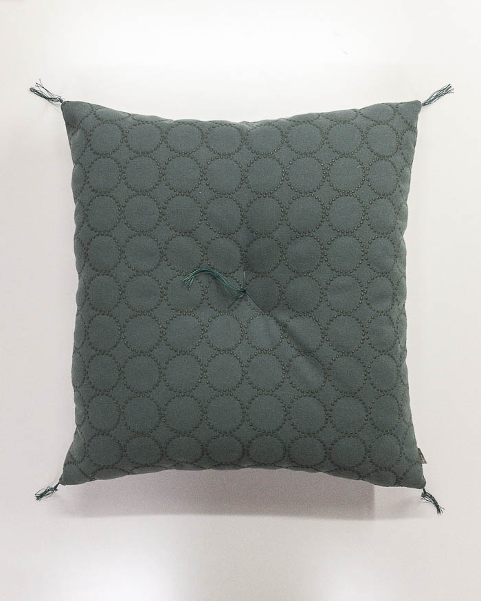 通常のお座布団は、一枚の布地を半分に折り畳んで周囲の三辺を縫い合わせて形をつくりますが、今回は布地が2枚になるので4辺全部を縫い合わせています。