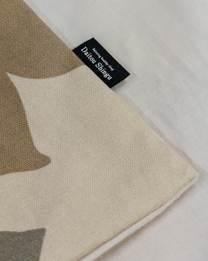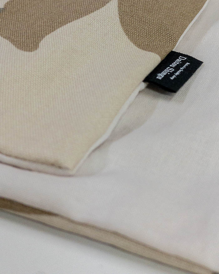 サイズは200 × 250cmの長方形です。表地がベージュ系のリーフ柄で、裏地が無地のベージュになります。大判サイズになりますので、まん中で貼いで裏側の中心にファスナーを付けています。