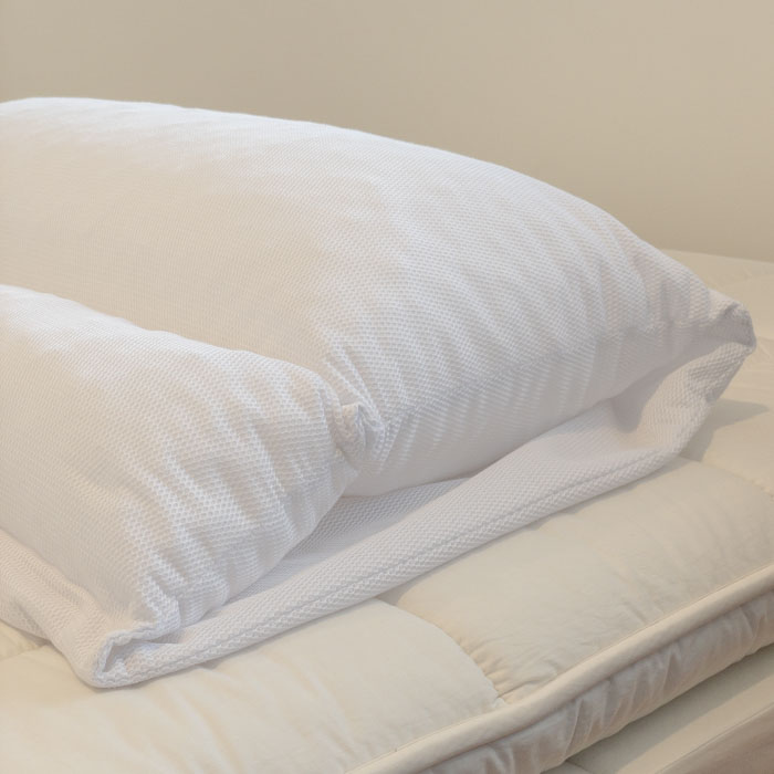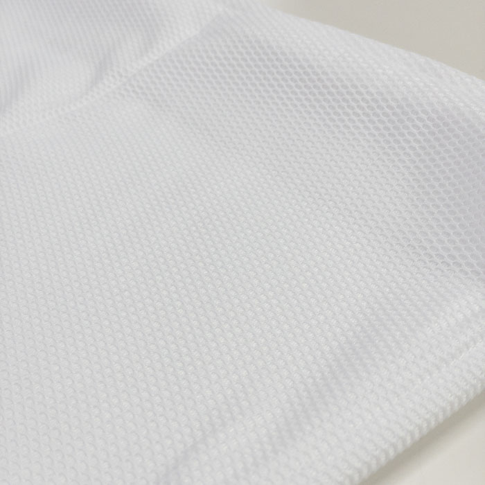 生地は「エコペット®️」を使用したECOメッシュ生地。吸水速乾性に非常に優れ、耐久性も高く、中材のアクアビーズの通気性を損なわないため枕本体に最適な生地です。またペットボトルや衣料品などを原料としたリサイクル繊維で環境へ負荷を考慮したサスティナブルな素材です。