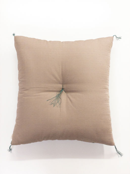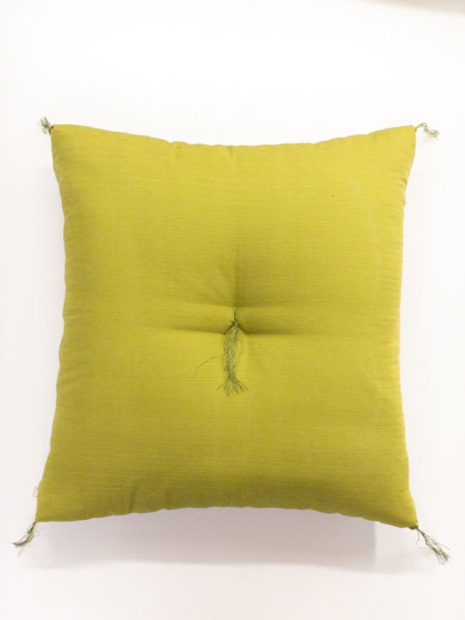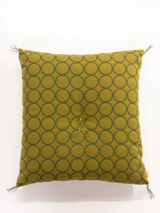 今回は、以前にご紹介したミナペルフォネンのタンバリン柄の円形座布団と同じ新色で、綿紬と組み合わせた2種類のリバーシブル座布団です。サイズが銘仙判という55X59(cm)で中綴じと四角に房をつけて仕上げています。